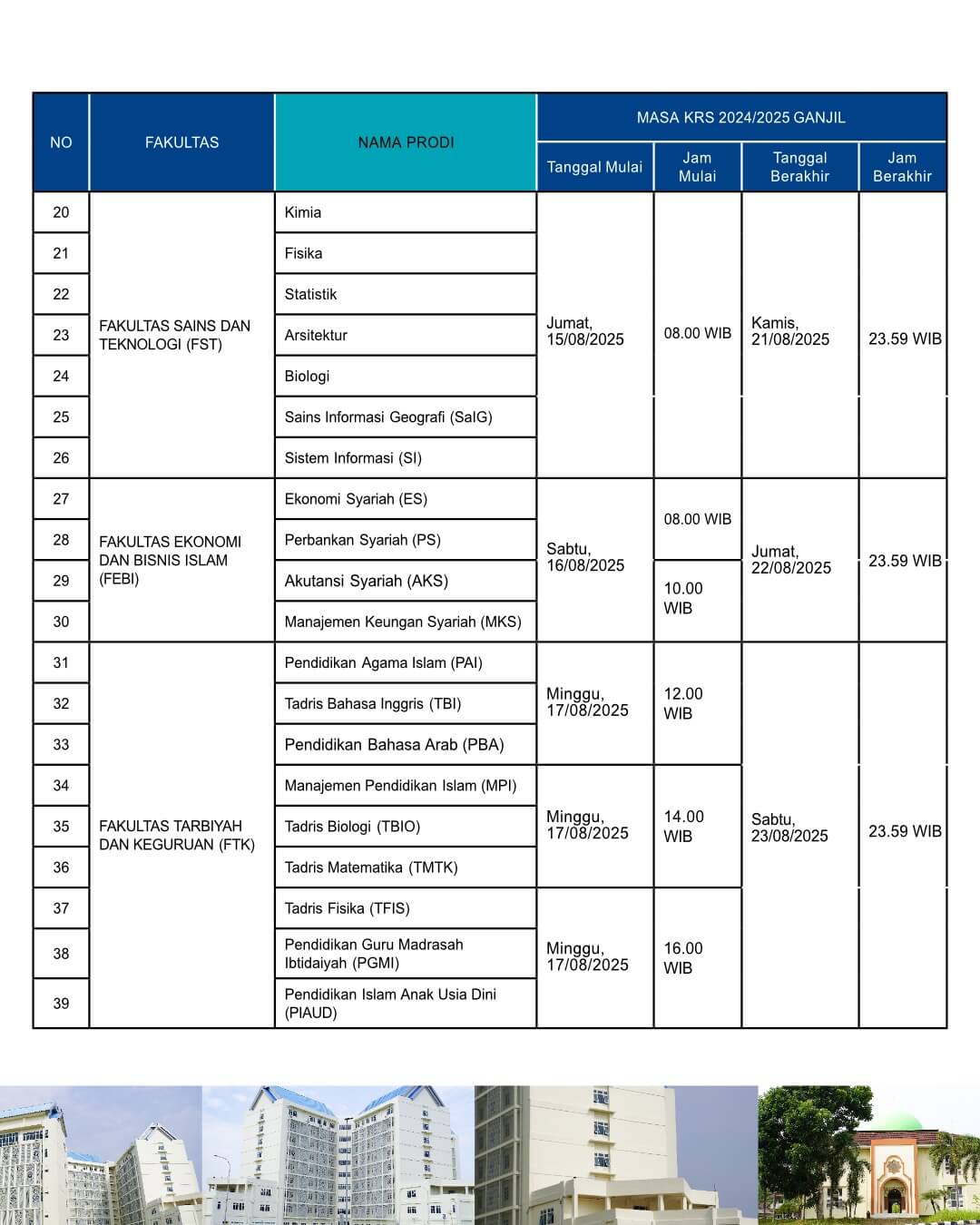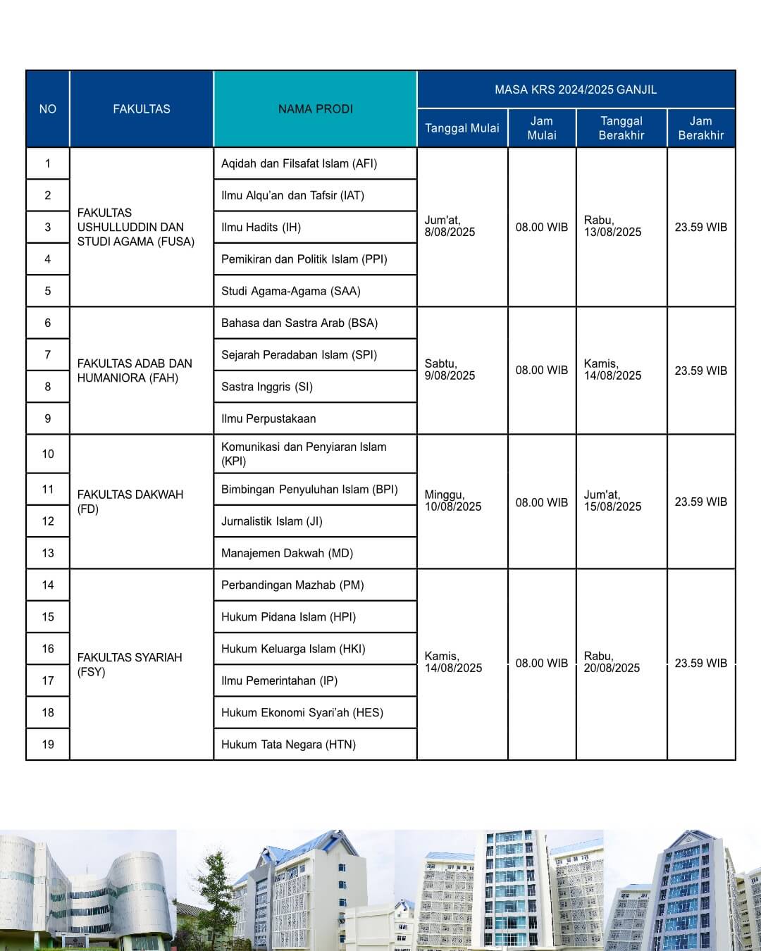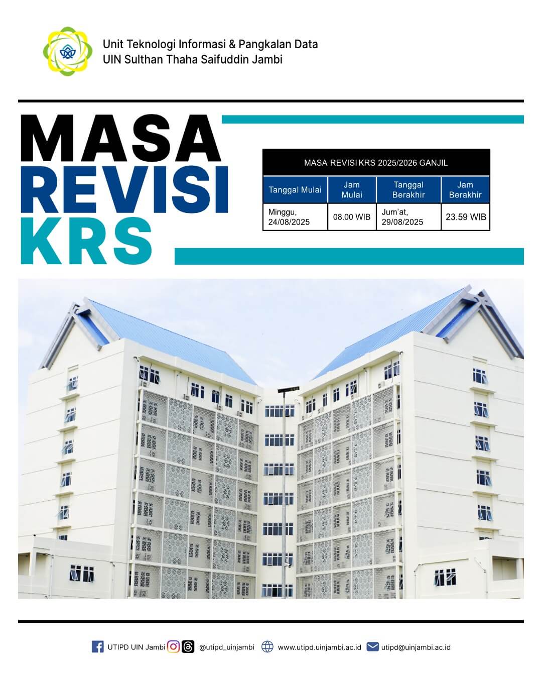 Berikut disampaikan jadwal pengisian dan masa revisi KRS bagi mahasiswa UIN Sulthan Thaha Saifuddin Jambi semester ganjil tahun akademik 2025/2026. Kepada seluruh mahasiswa semester 3, 5, 7, 9, 11, dan 13 untuk memperhatikan jadwal pengisian KRS berikut ini: